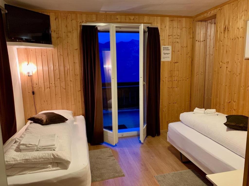 This room is located on the first floor and is accessible via stairs. It comes with 2 single beds, a kitchenette, and a bar table. It also features a private balcony offering stunning views of the Jungfrau and Lake Thun. The private bathroom is fitted with a shower.